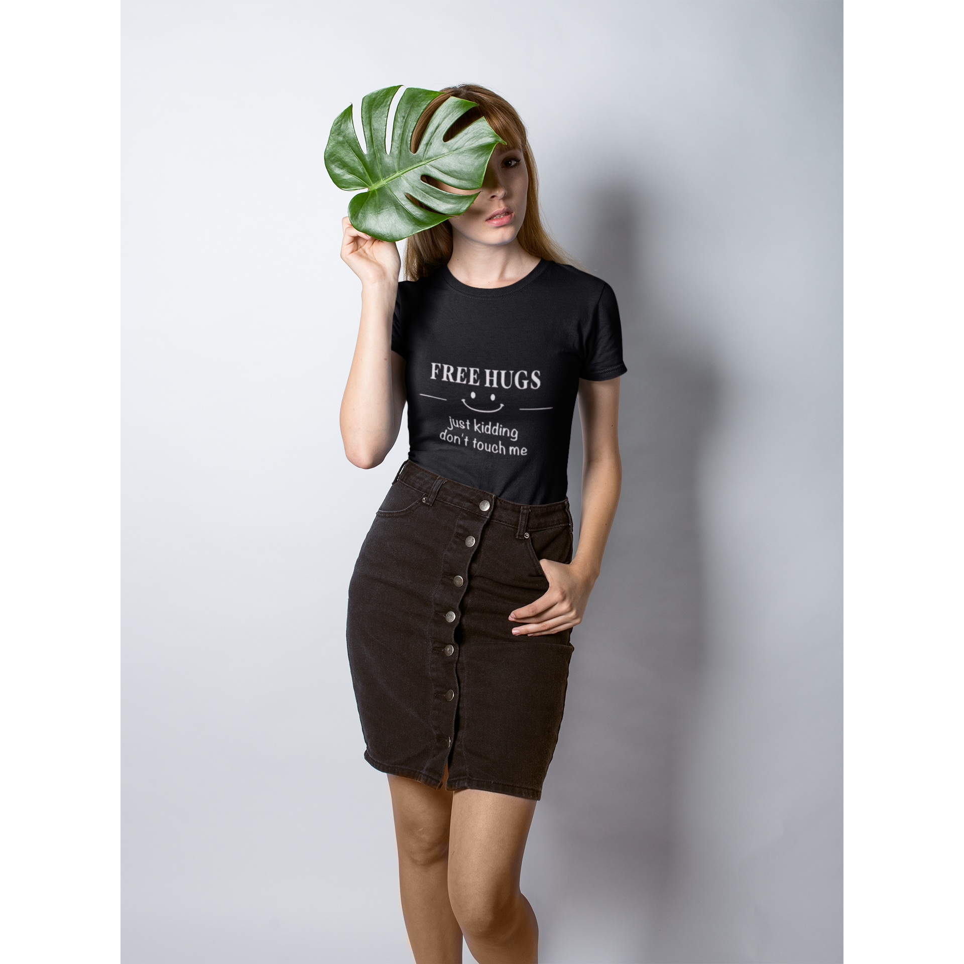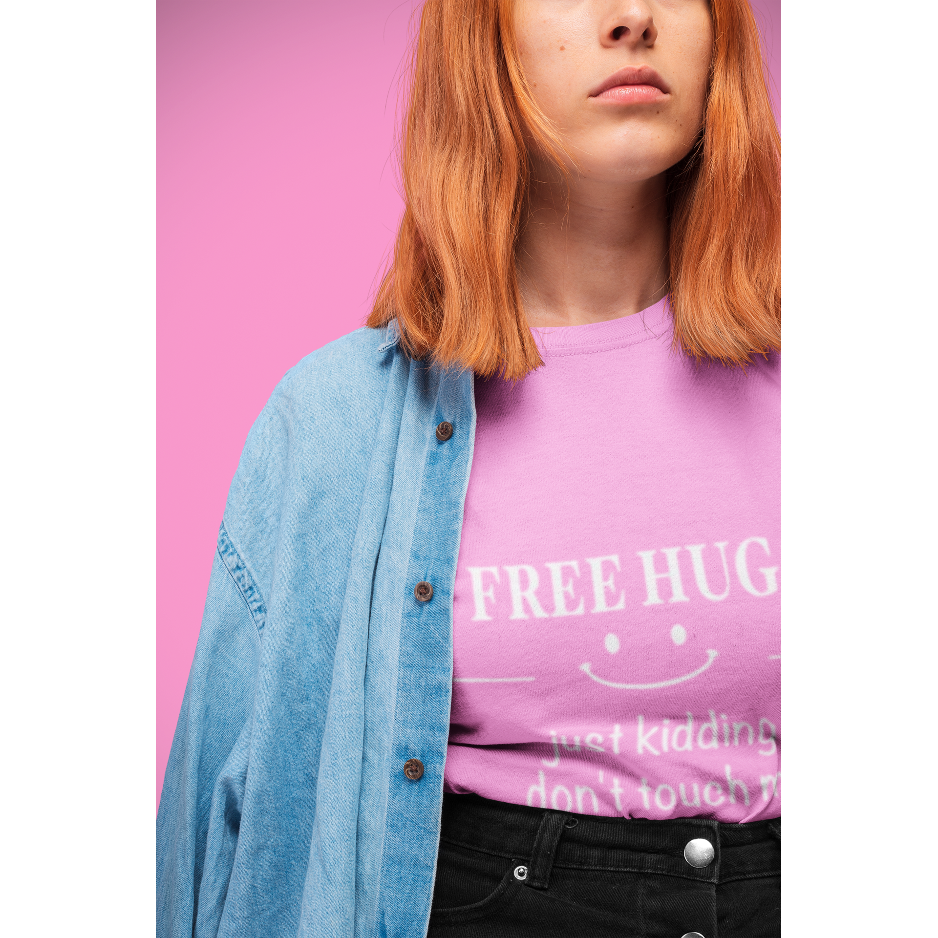 Show off your hilarious sense of humor with your casual outfit when you rock this Free Hugs Don't Touch Me T Shirt. This tee is a great way to add some personality to any casual look and is sure to get some laughs from your friends.